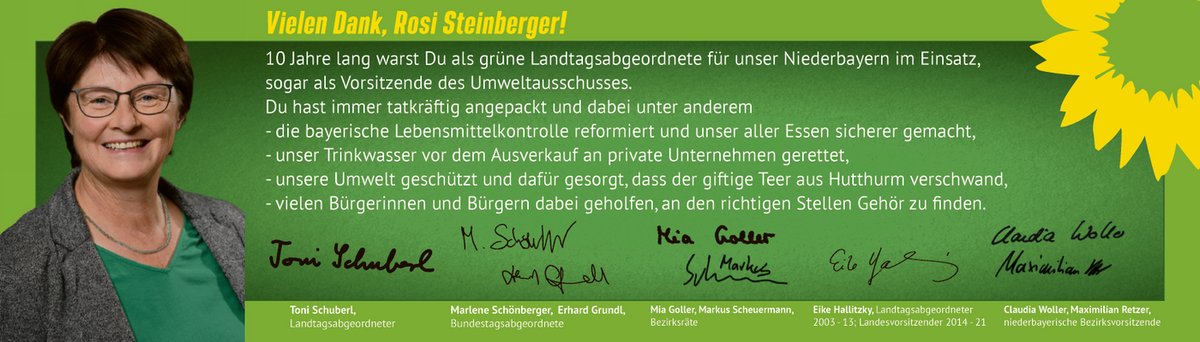 nach zehn Jahren endet meine Zeit als Landtagsabgeordnete. Ich verabschiede mich von allen, die mich in dieser Zeit begleitet haben. Ich danke meiner Fraktion und allen Grünen in Niederbayern für die immer gute Zusammenarbeit und Unterstützung, aber auch den Mitgliedern des Ausschusses für Umwelt und Verbraucherschutz für das gute Miteinander.